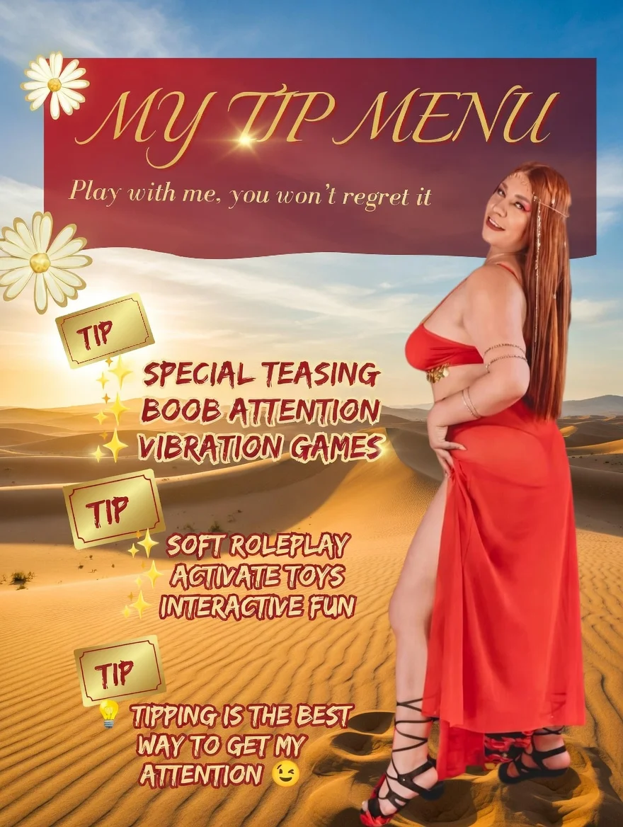 💎 Menú de Tips 💎 ✨ Coqueteo especial ✨ Atención a mis bubis ✨ Juegos con vibración ✨ Roleplay suave ✨ Activar juguetes ✨ Juegos interactivos 💡 Tippear es la mejor forma de llamar mi atención 😉 💎 Tip Menu 💎 ✨ Special teasing ✨ Boob attention ✨ Vibration games ✨ Soft roleplay ✨ Activate toys ✨ Interactive fun 💡 Tipping is the best way to get my attention 😉